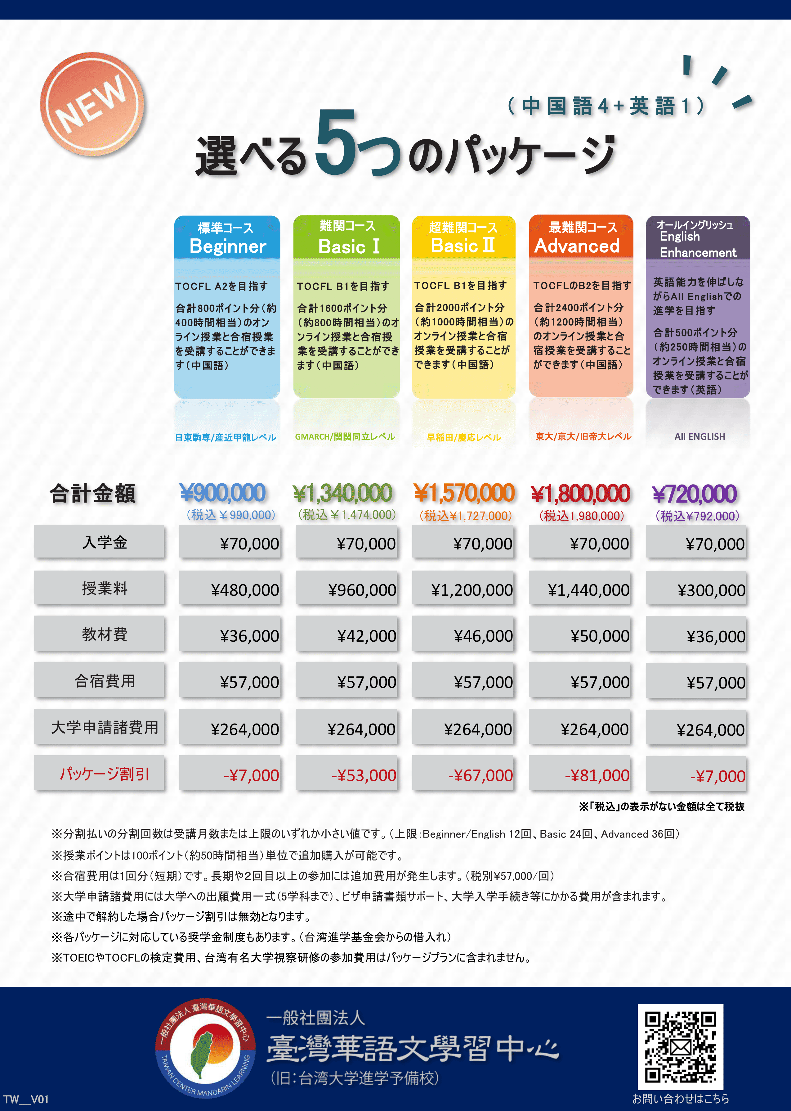 - 台湾の費用だけは、当校の受講費が加算されています。
